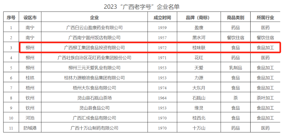 近日,廣西商務廳公示了2023“廣西老字號”認定評審結果,廣西柳工集團食品投資有限公司(下稱食品公司)“桂味聯”品牌入選。